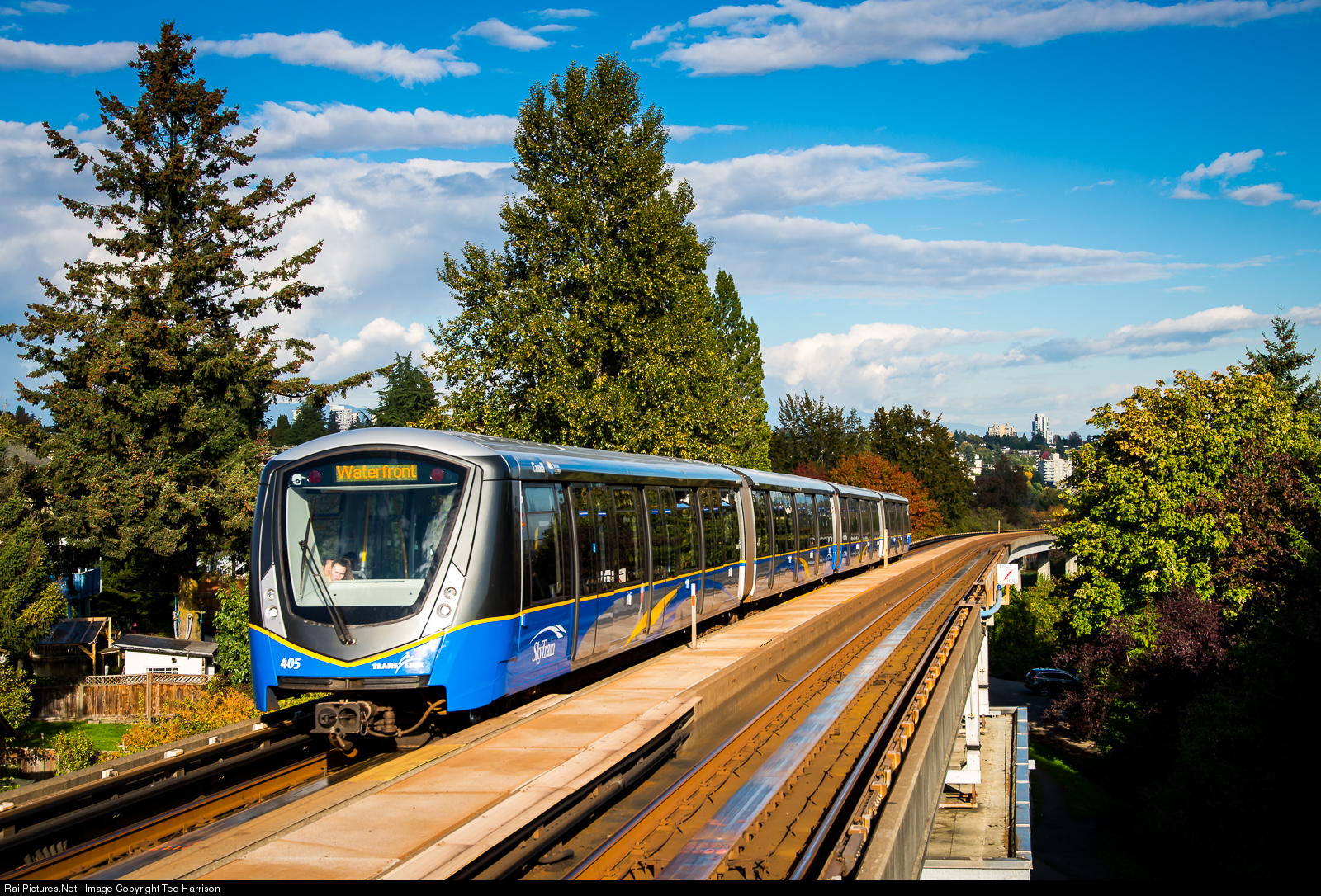 Bound for Waterfront, a new Bombardier "Innovia Metro 300" trainset pulls into 22nd Street Station on the Expo Line. With 79.5km of track on 3 lines, serving 53 stations, the Skytrain network in Greater Vancouver is the largest automated driverless metro system in the world.