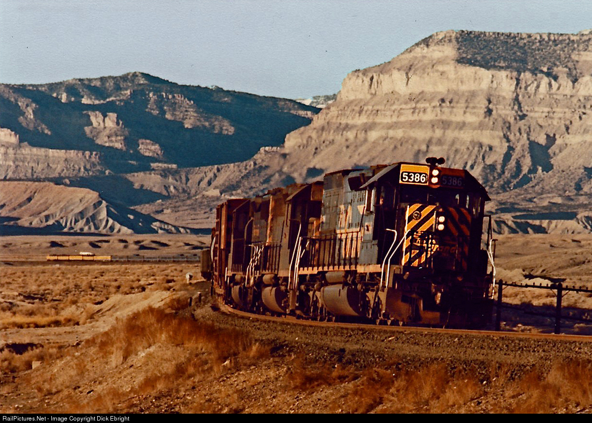 | I sure wish I could recreate this shot with a modern Digital Camera. The eastbound freight led by DRGW 5386 is pulling onto the mainline from Grassy Siding in eastern Utah. It has just met the westbound Rio Grande Zephyr, #17, which is seen in the background. This image was scanned from a color print. |
