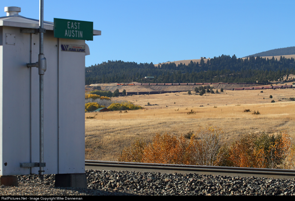 A westbound BNSF grain train works up the 2.2 percent grade of Mullan Pass as the train wraps through two huge horseshoe curves in the climb out of Austin, Montana, on October 16, 2018. The head end of the train is at a location called “Weed,” while the middle part of the train is seen between the two horseshoes. The track in the foreground past the East Austin signal box saw passage of the lead locomotives about fifteen minute earlier. Not visible is a lone DPU on the rear of the train, and in the upper horseshoe to the right, a four-unit set of MRL EMD SD70ACe helpers entrained toward the middle of the heavy grain cars. These units will be cut out on the other side of the pass at Elliston and then return to Helena to help another “heavy” train.