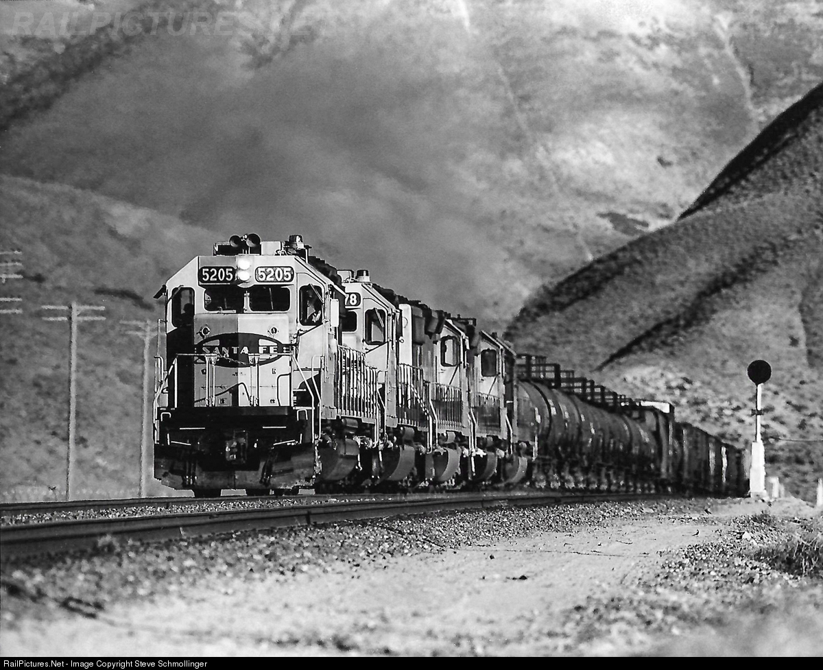 Santa Fe 5205 West roars up the steep grade on the eastern slope of Tehachapi Pass. Compared to the 30+ miles it takes for eastbounds to reach the summit of the mountain, trains coming west reach it in only 18. As soon as trains depart Mojave Yard and head up the hill, they hit a stiff grade that doesn't relent until they reach the Tehachapi Valley at the top of the pass.