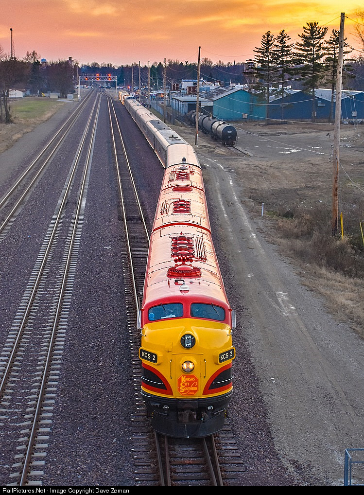 | With a very colorful sunset behind, KCS 2, 3, and 1 rest in Godfrey, IL while the KCS holiday train puts on a show for the local community. |