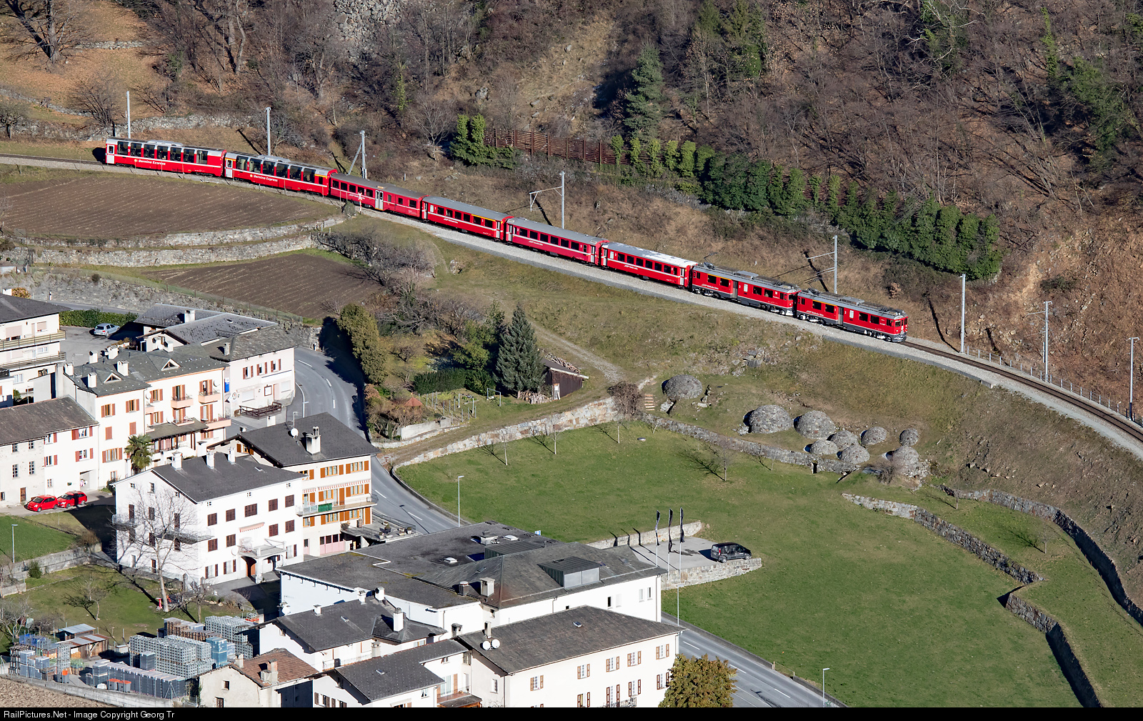Railcars ABe 4/4 # 56 "Corviglia" and # 51 "Poschiavo" are pulling Regional train 1625 from St.Moritz to Tirano at Brusio towards the spiral viaduct. Note the snow in the bogies of the railcar: Up on the Bernina pass are very harsh winter conditions. In the rear of the train are two panorama cars of the BERNINA EXPRESS, which are surplus in this time of the year and added to regular passenger trains on the Bernina line, with a supplement of 5 swiss francs to pay. Below the track, you can see 9 stone buildings, with a particular shape, typical of the region. These are the crotti, small buildings of uncertain origin, built centuries ago. They were built both in cool and shady areas, because they were used in particular for the preservation of fresh products, and in dry and open areas because sometimes used as a kitchen, or even as a temporary home during the summer season.