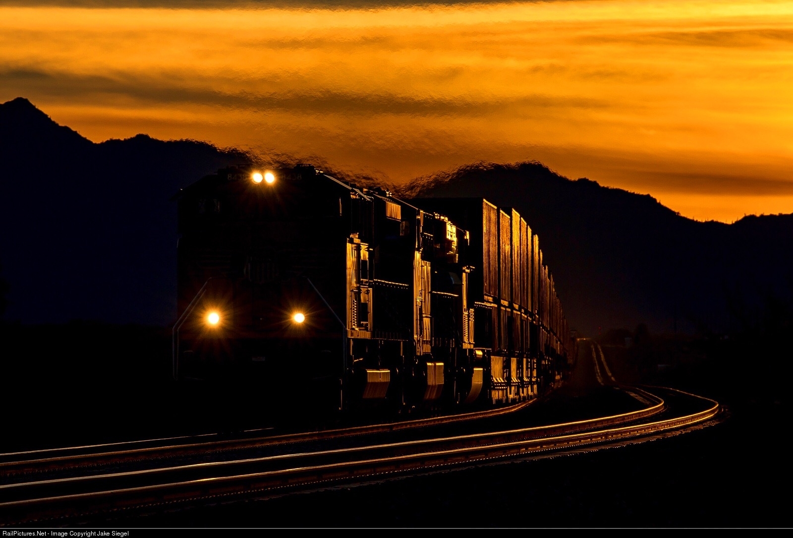 | Just before the sun dips behind the mountains, a Union Pacific intermodal accelerates out of Estrella on an unusually busy Sunday along the sunset route. |