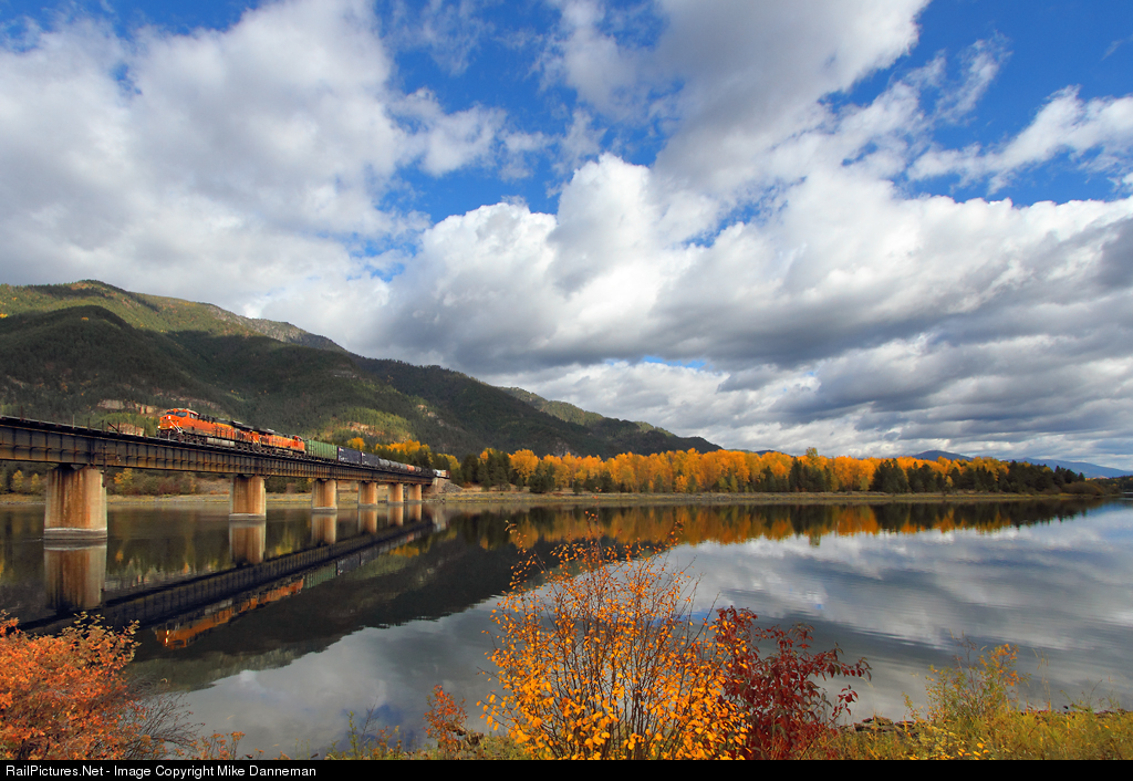 A westbound BNSF freight crosses the Clark Fork west of Noxon on a gorgeous Autumn afternoon in Montana on October 13, 2018.