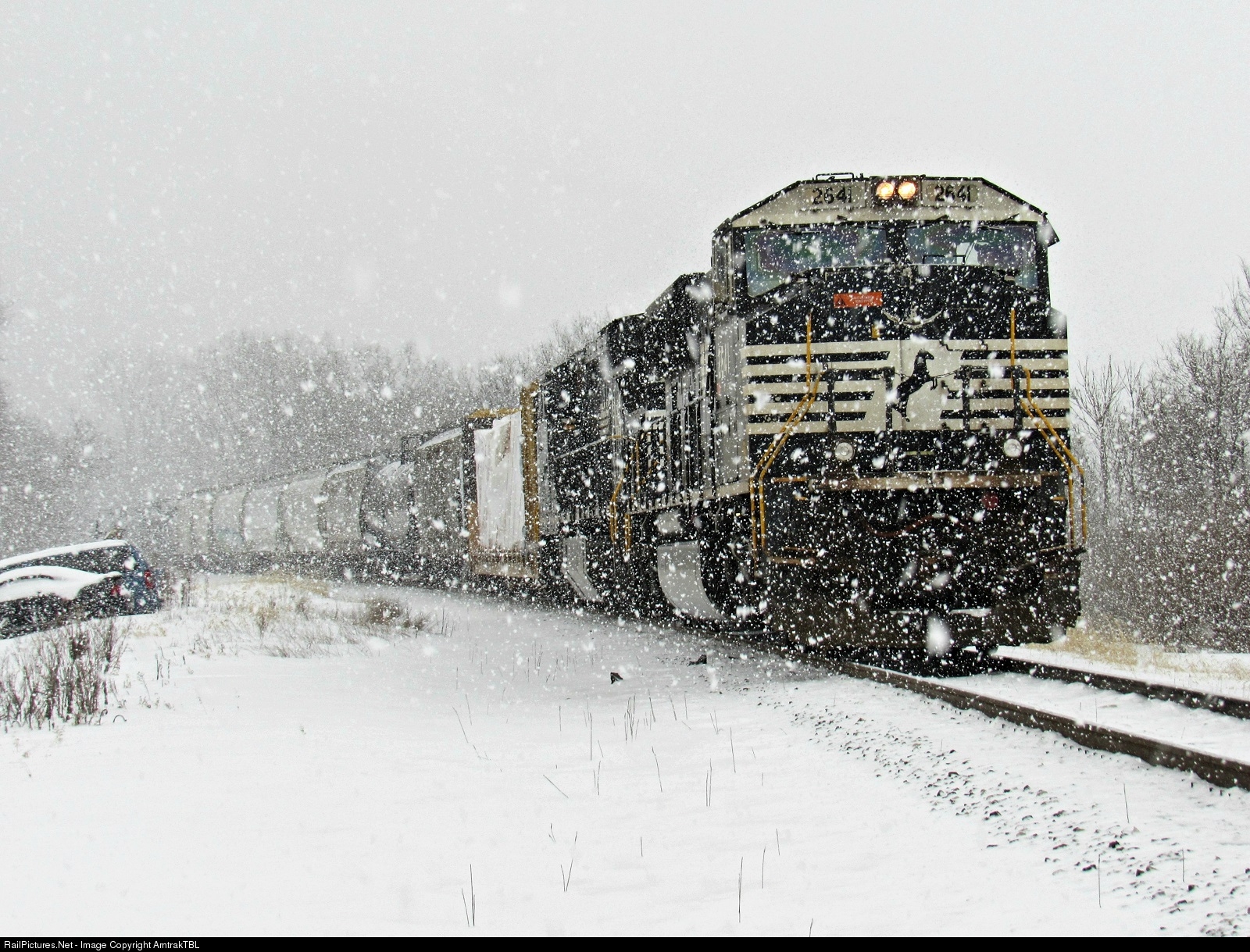 A NS Train waits for signal at 18th street in heavy snowfall.
