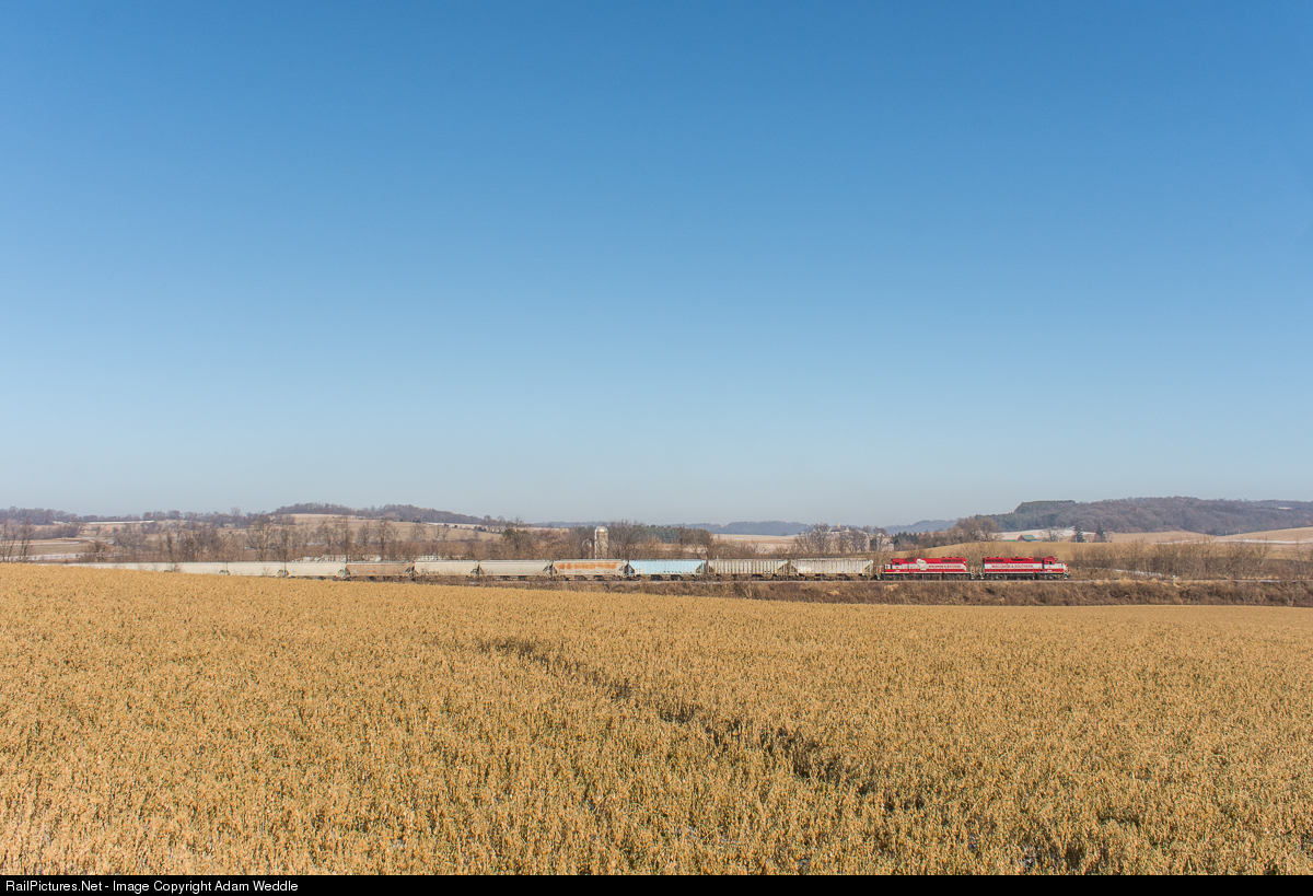 | With a combined total of 5300 horsepower, the WSOR EMDs tackle the 1 percent grade between Lodi and Dane, with a decent size train in tow. |