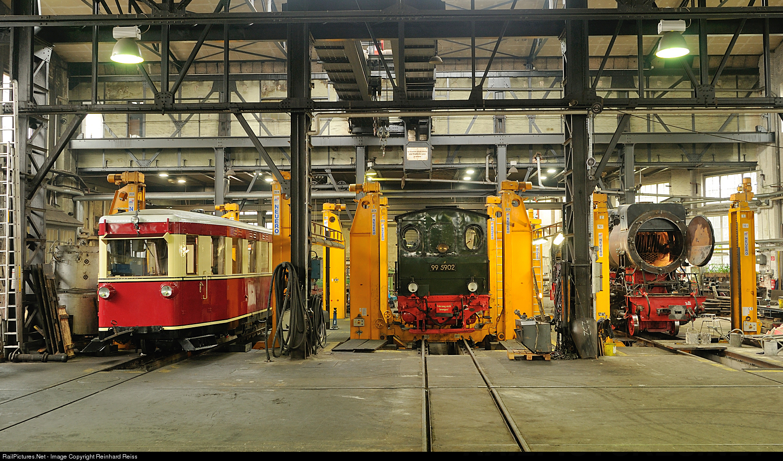 | Various activities in the shop of the Harzer Schmalspurbahnen at Wernigerode (Harz). On the left railcar 187 is almost ready for returning into service after a major overhaul. In the middle Mallet 99 5902 and on the right 99 7232 get a repair. Photo taken with permission. |
