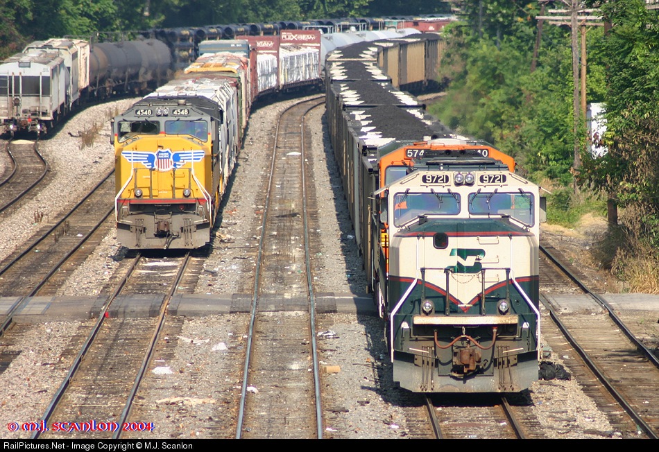 | BNSF has brought this loaded coal train to Neptune Street for an exchange to the NS. UP's exchange to the NS sits on the east main, led by UP 4548, as it also waits for a crew. |