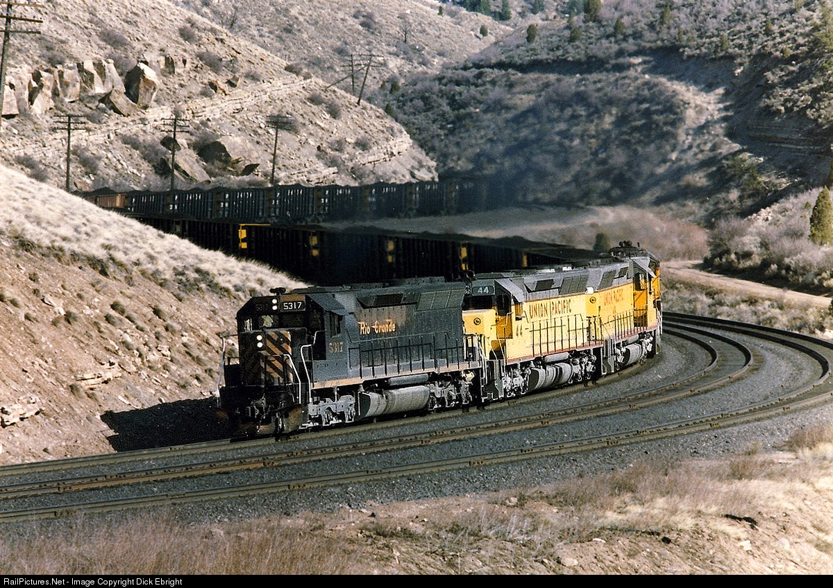 This is the well known Kaiser Unit Coal Train, Rio Grande #769, operated jointly by the D&RGW and the Union Pacific. Both railroads used pooled SD45's exclusively on this train. It ran between the Sunnyside coal mine in Utah and the Kaiser steel plant in Fontana, California. It is seen here at the S curves at Kyune, Utah, on the east side of the grade to Soldier Summit. Scanned from a color print.