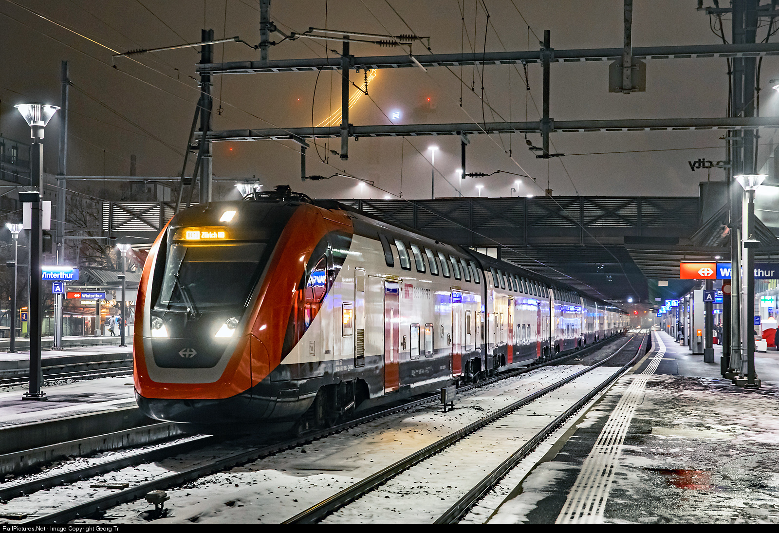 Since change of timetable on december 9th, the new doubledeck Intercity trains from Bombardier "FV Dosto" began timetabled service on the Interregio line 13 between Chur, Sargans, Buchs, St.Margrethen, St.Gallen, Winterthur and Zürich and vice versa. The quality of the new train is poor, 8 1/2 years after the order. RABe 502 # 205 (IR200) in multiple with RABe 502 # 404 (IR100), running as Interregio 13 # 3280 from Chur to Zürich, is leaving Winterthur 34 minutes late.