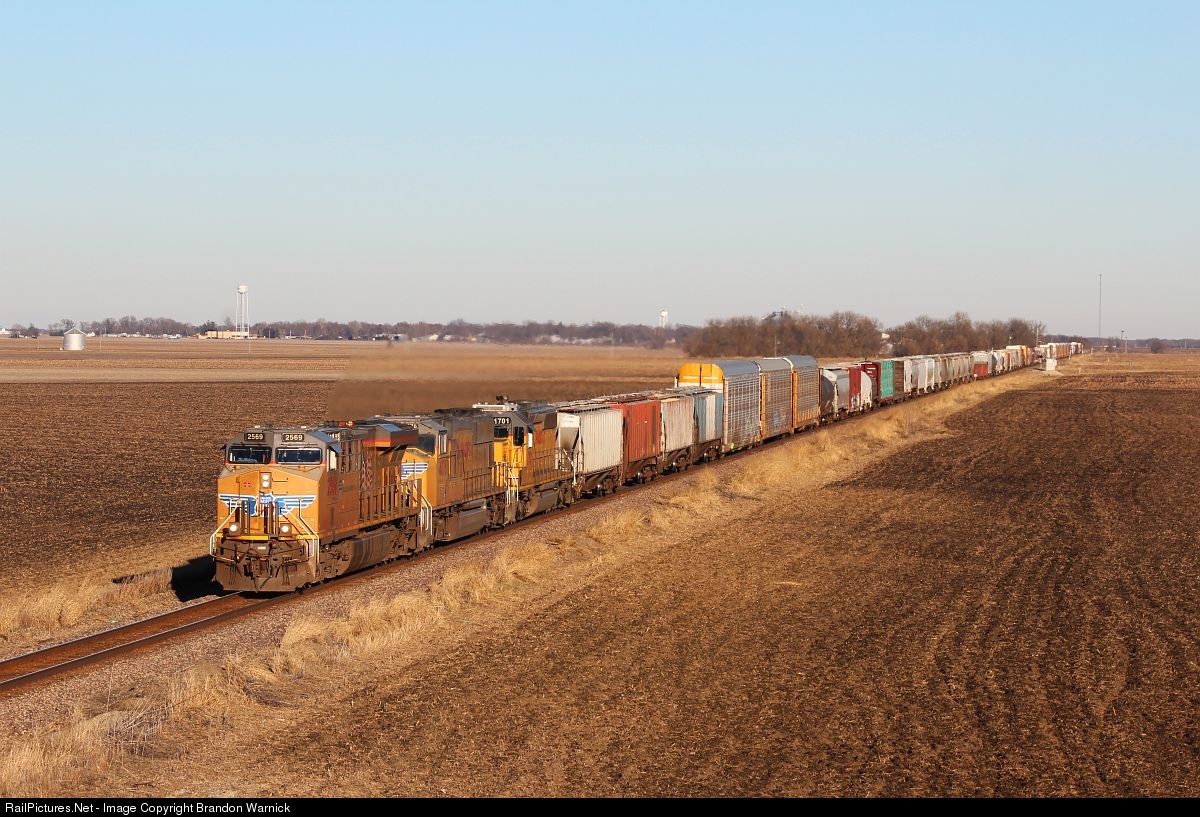 UP #2569 leads a long manifest west out of Findlay Illinois.