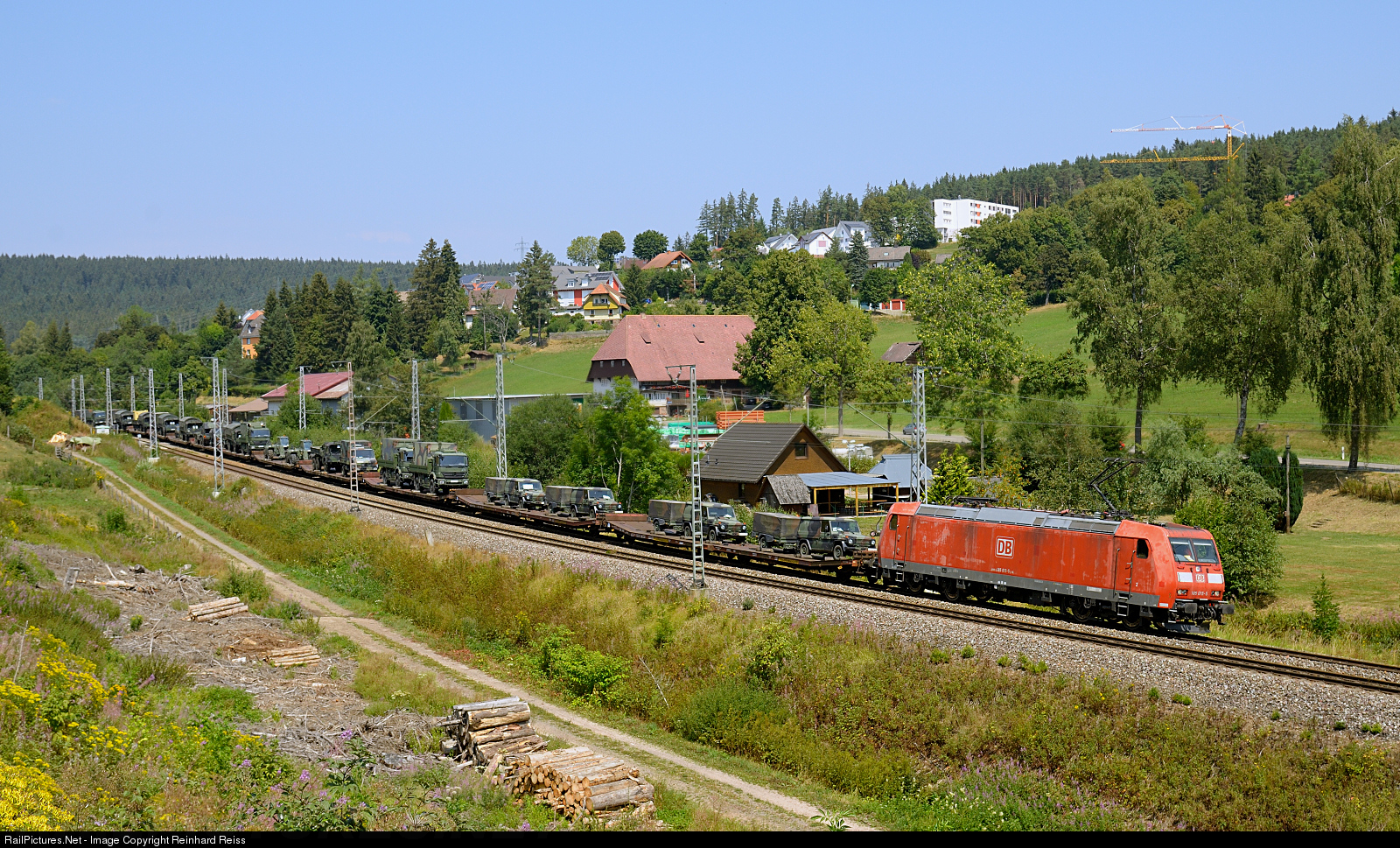 185 015 from DB Cargo passes Sommerau (summit of the Schwarzwaldbahn [Black Forest railway]) with a southbound military freight.