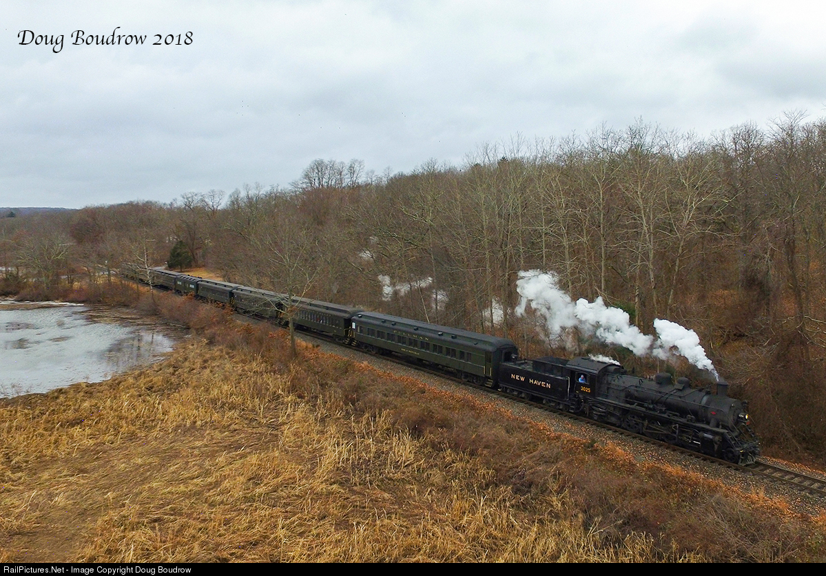 | The Connecticut Valley Railroad, also known as the Essex Steam Train & Riverboat runs a number of Christmas trains each season. On weekends during the season, the railroad is running trains for most of the day using all three operable steam locomotives on the roster. Valley #3025 is a 1989 Chinese Mikado that is rebuilt to resemble a New Haven Railroad Class J-1. Here the train is seen passing Pratt Cove. |