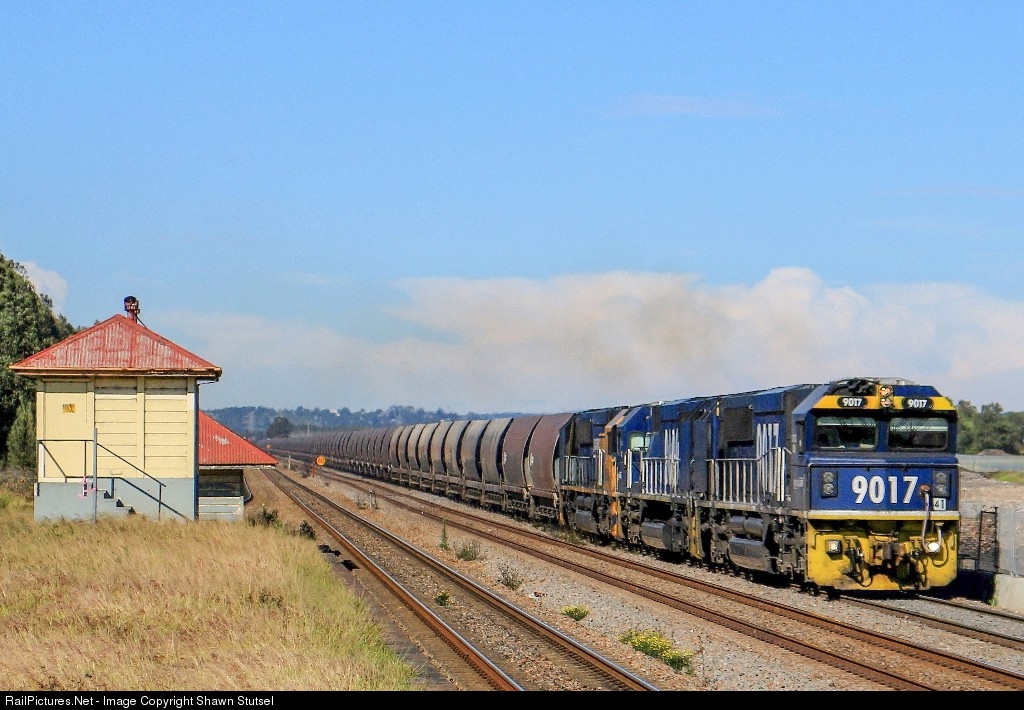 Triple 90's for Pacific National with 9017 leading powers past the old signal box at Hexham, Newcastle with a Down Empty Coal Service...