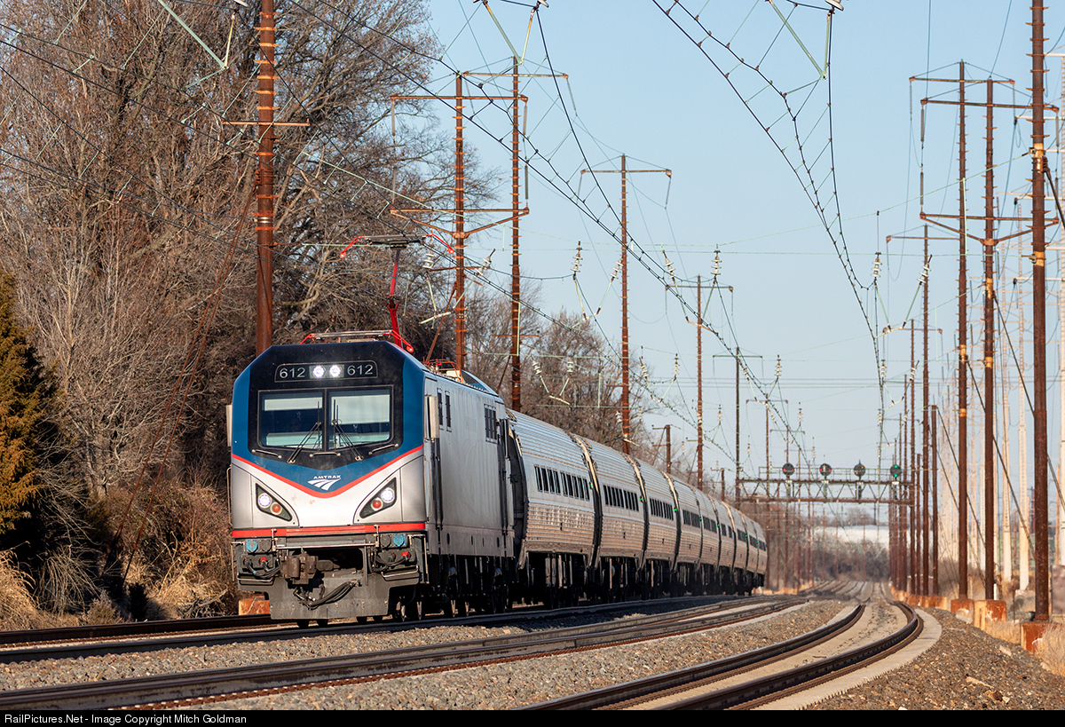 | An Amtrak Regional Express led by AMTK No. 612 whips around a super-elevated curve on the express track just shy of Claymont station in Delaware. Note the surviving Pennsylvania signal bridge in the distance. |