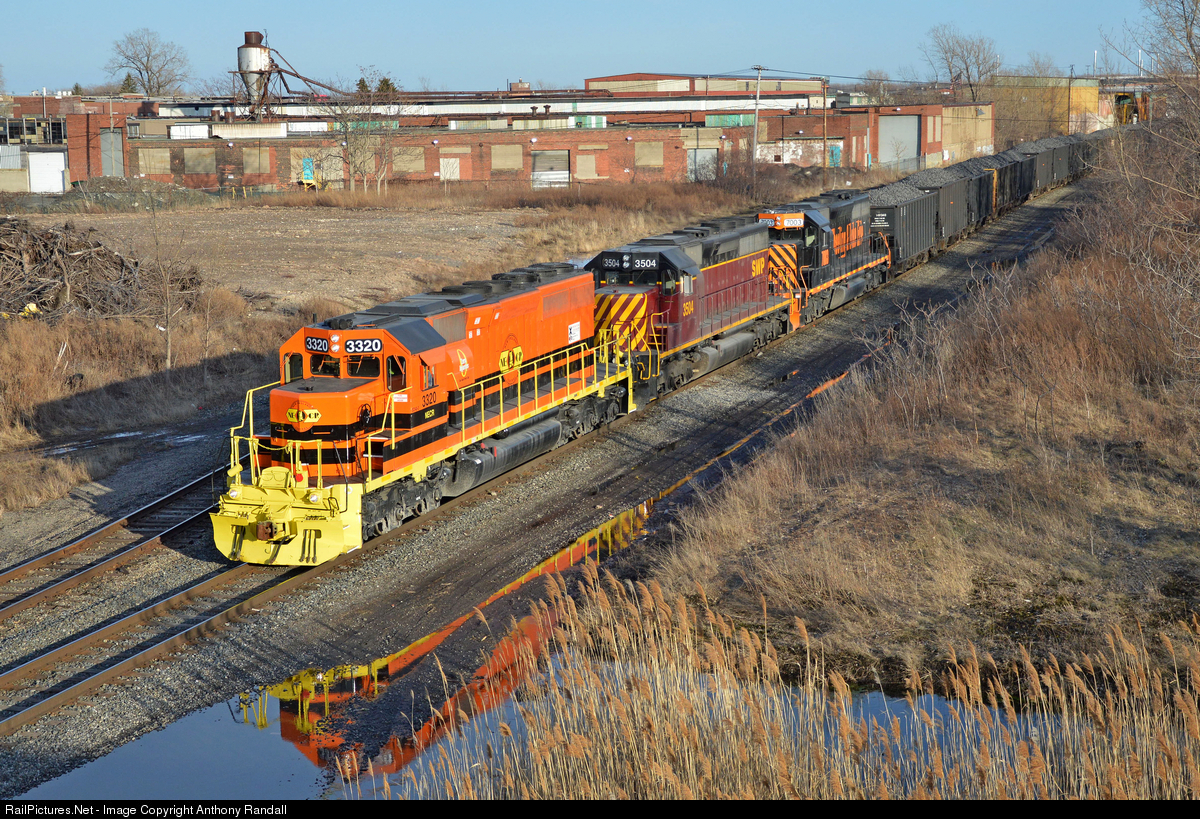| A loaded coke train creeps up the Ebeneezer Secondary by Babcock Yard. While the lead unit is lettered for NECR, the corporate paint schemes of all three short lines involved in the movement of these coke trains are represented in the consist. |