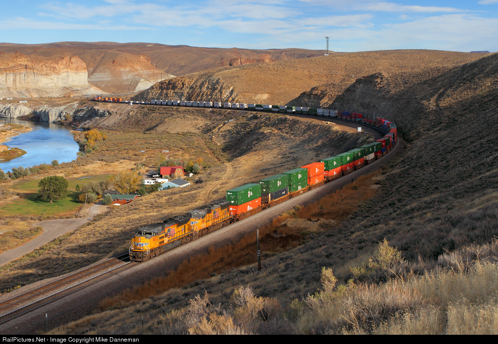 | A westbound Union Pacific stack train heads up Peru Hill west of Green River, Wyoming, late in the afternoon of October 9, 2015. |