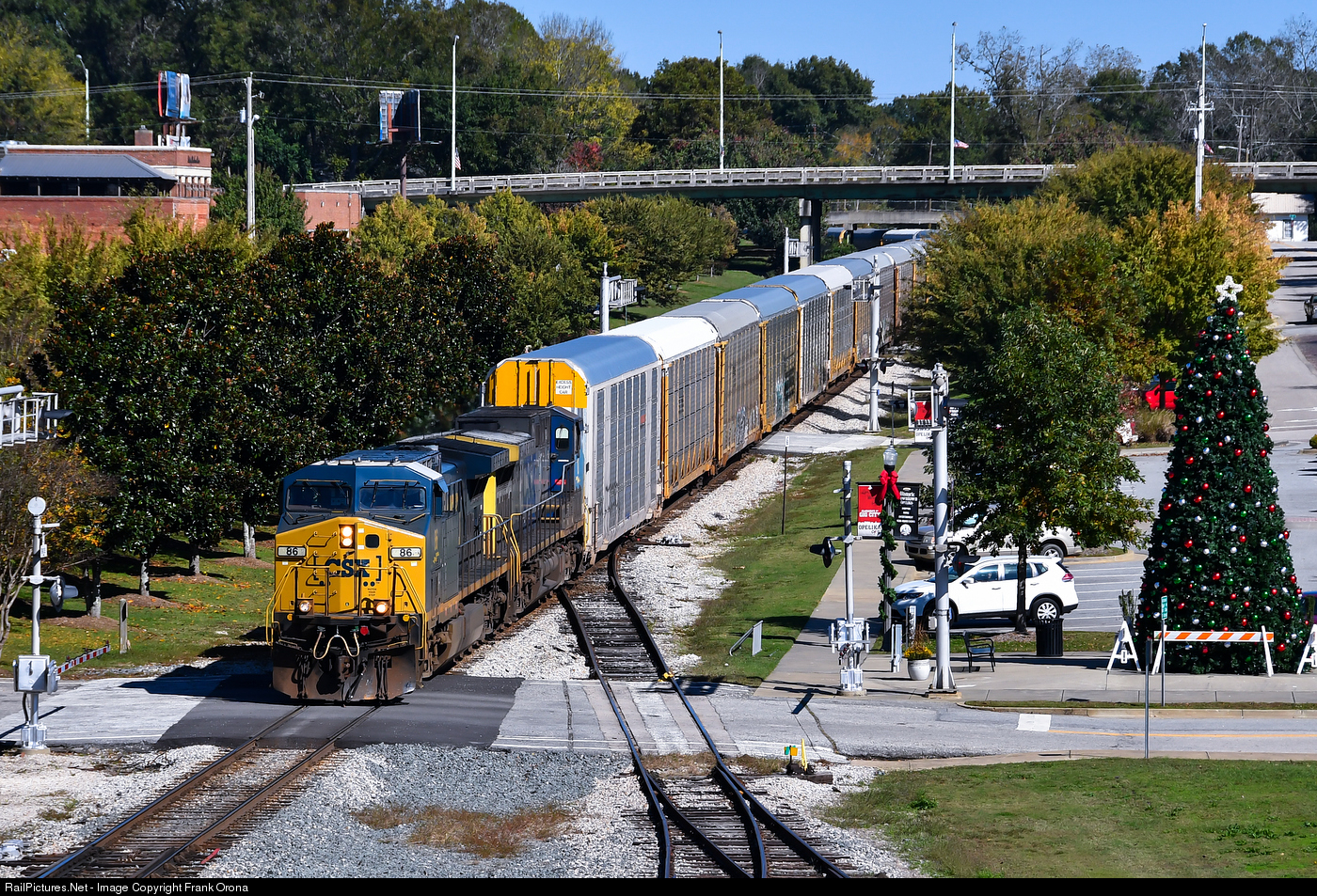 | It’s nearly Christmas time and the city of Opelika has just finished decorating their public tree as the southbound Q220 comes into town with over 9300 feet of train. Perhaps one of the new Kia models inside these auto racks will end up under someone’s tree this holiday season. |
