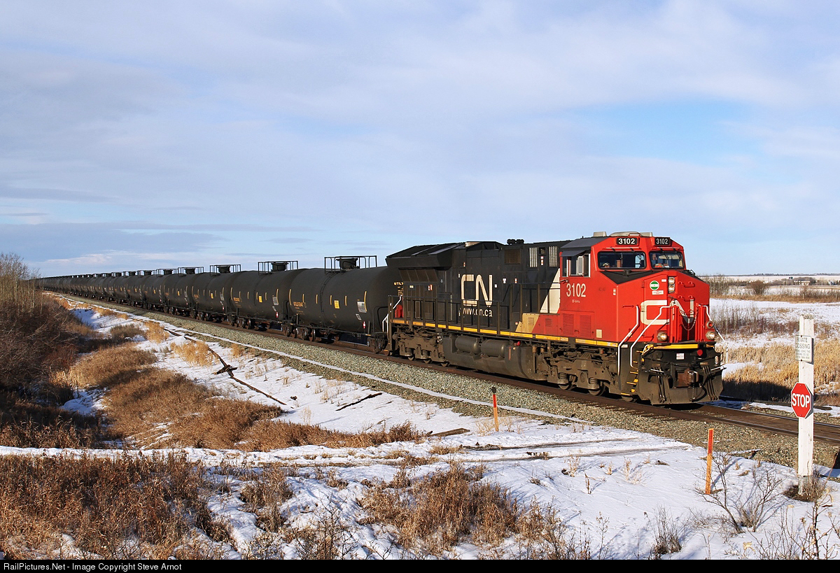 CN ET44AC 3102 leads a loaded crude oil train east on the Wainwright Sub.
