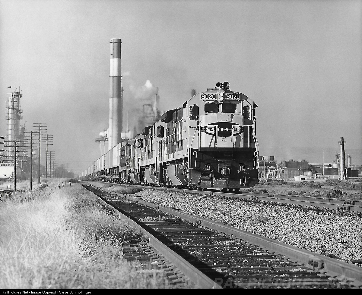 On the morning of October 5, 1985, Santa Fe 8020 East accelerates out of Avon after coming off the Franklin Canyon grade. The train is a 54-car 991 bound for Chicago. In the distance is the tall stack of the Tosco Oill Refinery, one of the centerpieces of the Avon refinery-chemical plant complex.