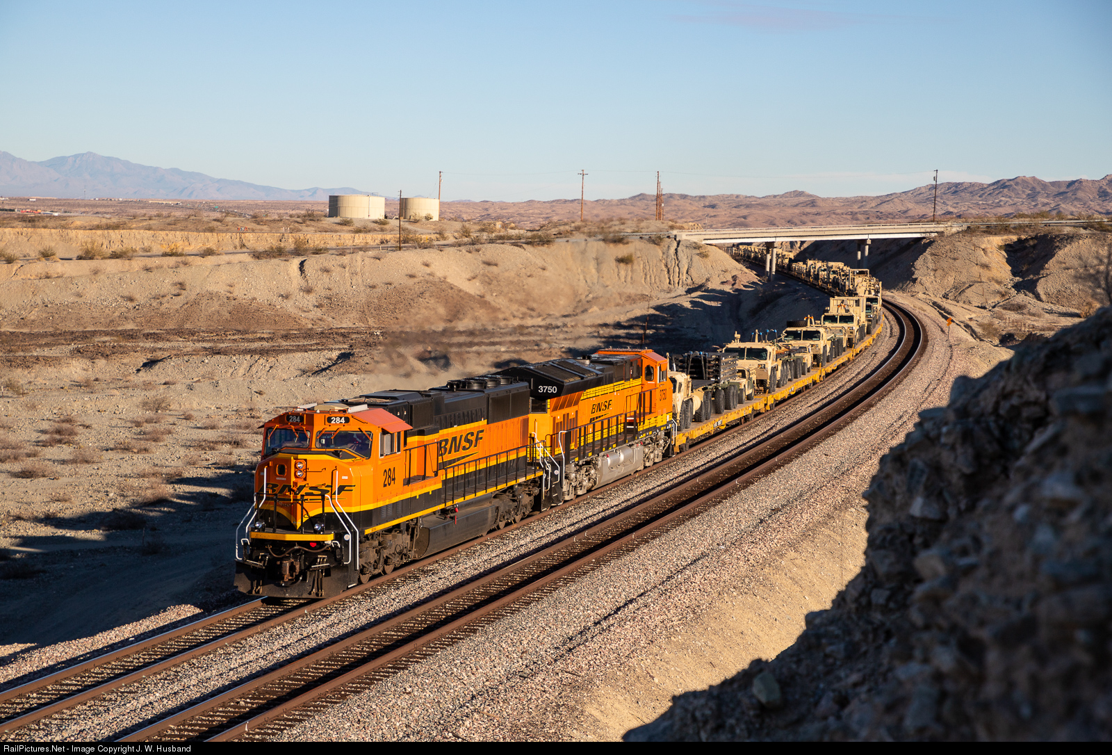 A westbound BNSF military train led by a sharp looking BNSF SD75M (and not common out west) has just crossed into California as it rolls through Park Moabi and toward an eventual crew change at Needles.