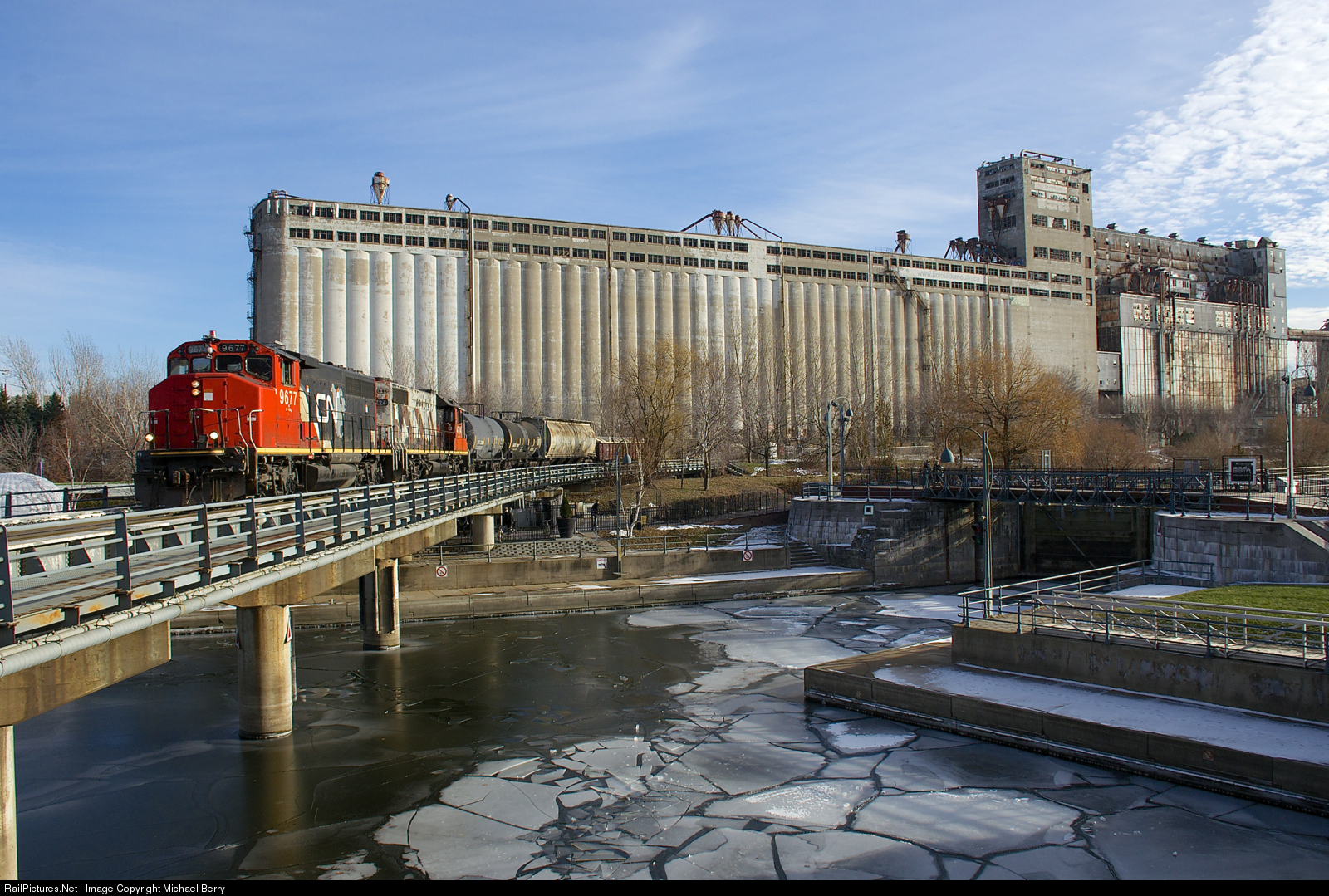 CN 9677 & CN 4724 have just 4 cars to interchange with the Port of Montreal as they pass grain elevator #5 and cross the partly frozen Lachine Canal.