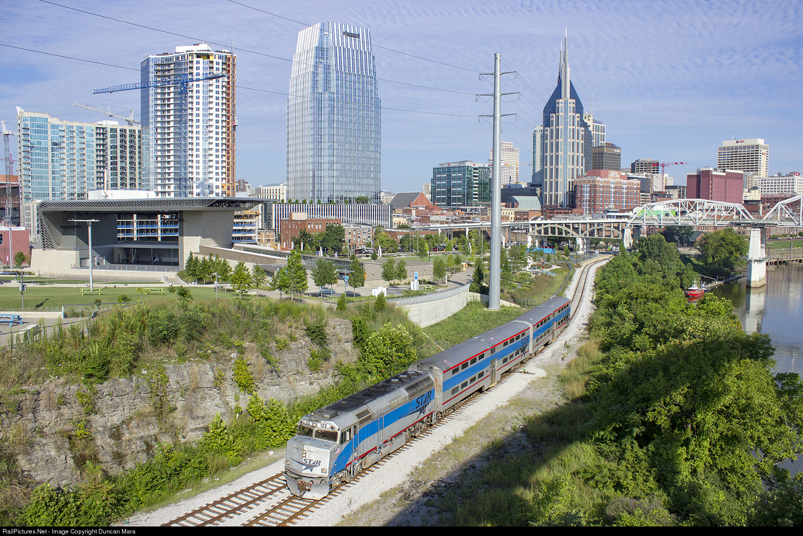 | Nashville Music City Star commuter train 155 departs its namesake city on a hot and humid Tennessee morning. The train is seen from the Shelby Street Bridge, which is situated along Nashville's Riverfront. |