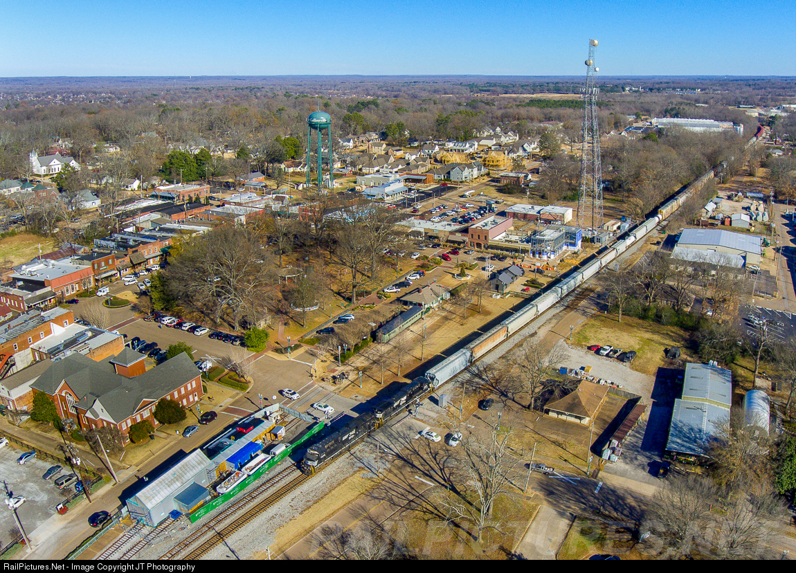 NS 3609 leads a westbound manifest through the historic Collierville Square. Note Frisco 1351 is currently under cosmetic restoration (underneath the tarps in the bottom left).
