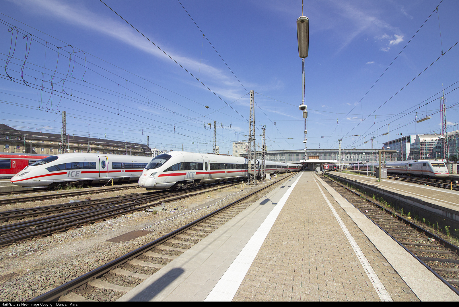 | A German ICE 3 trainset running as ICE 528 rips out of München Hauptbahnhof on its way to Dortmund Hbf. Two other ICE train varients sit below the mess of catenary that runs throughout the busy terminal on this hot July afternoon. |