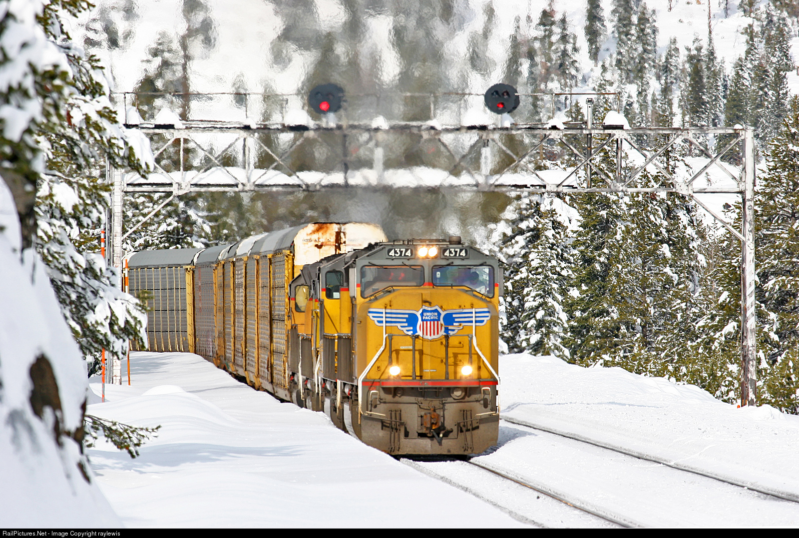 After a few days of snow, the sun breaks out brightening the beautiful snow covered terrain. Here UP 4374 leads an eastbound auto train through Troy, CA.