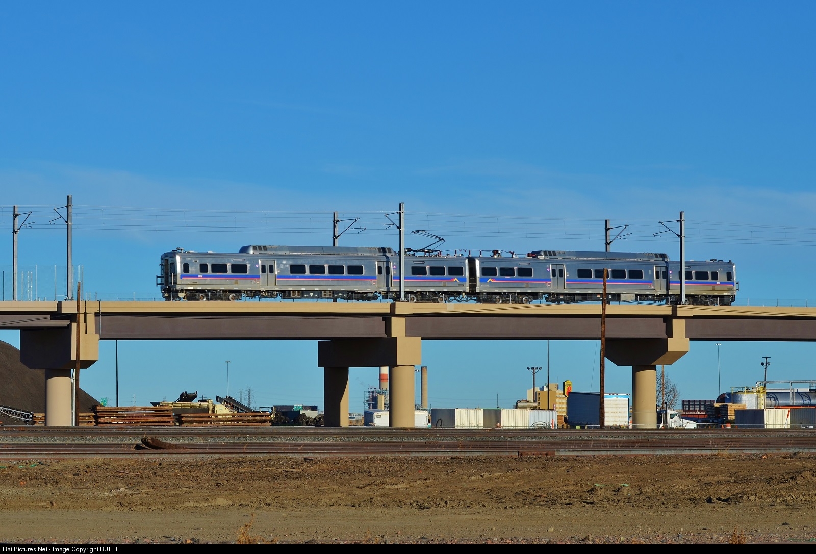 RTD commuter train #4018 (Hyundai Eagle P3) runs on an elevated section the flies over the UP's North Yard in Denver.