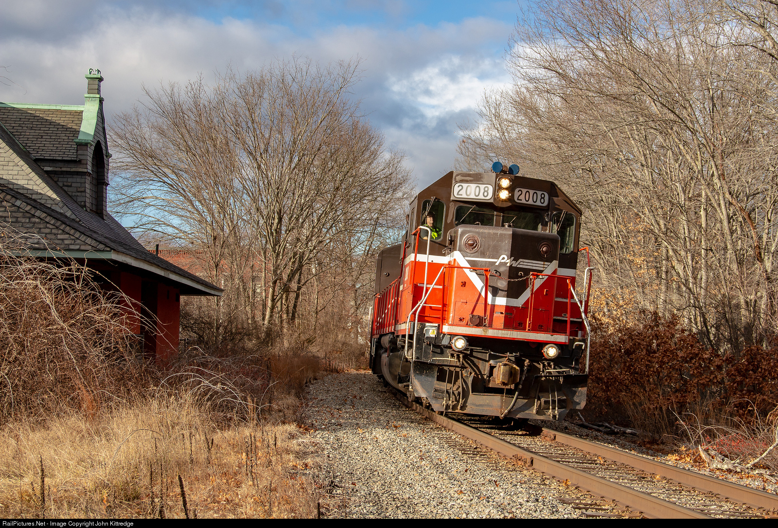 Providence and Worcester GP38-2 2008 rolls past the old station in Uxbridge, MA with the Blackstone Valley Tourism Council's Polar Express train. The trains this year have mostly been brackets by a set of P&W's nicely painted GP38-2s, a nice changes from the increasingly strong GW influence. Rumor is, these 6 Geeps, 4 of which were built new for the railroad, will be transferred to another GW property in the future.