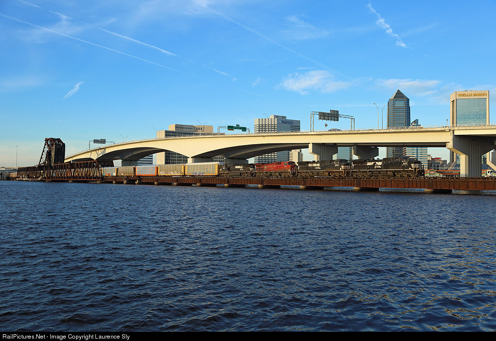 A Bowden bound Norfolk Southern train crosses the St John`s River in Jacksonville. Power is provided by 4120, 9502, 8501 & 9150