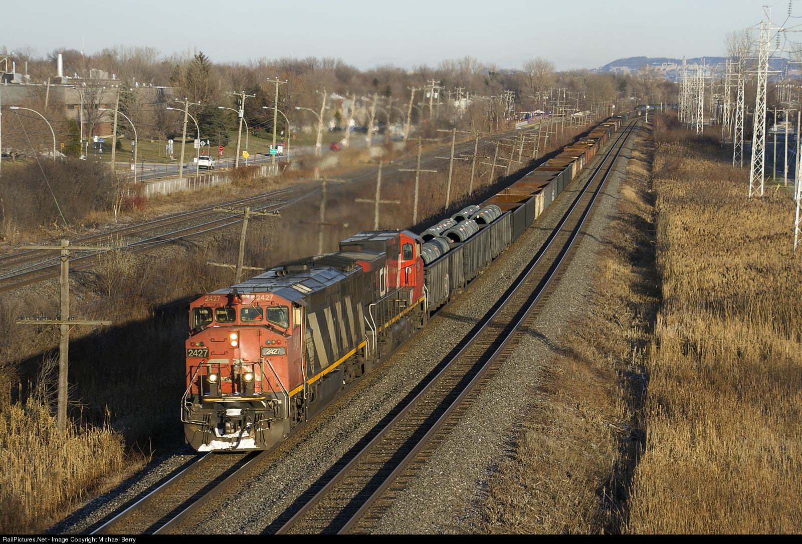 CN 2427 & CN 2554 lead a 75-car CN X321 westbound through Pointe-Claire on the Kingston Sub. The train is composed almost entirely of gons loaded with steel products, with about a dozen tank cars at the rear.