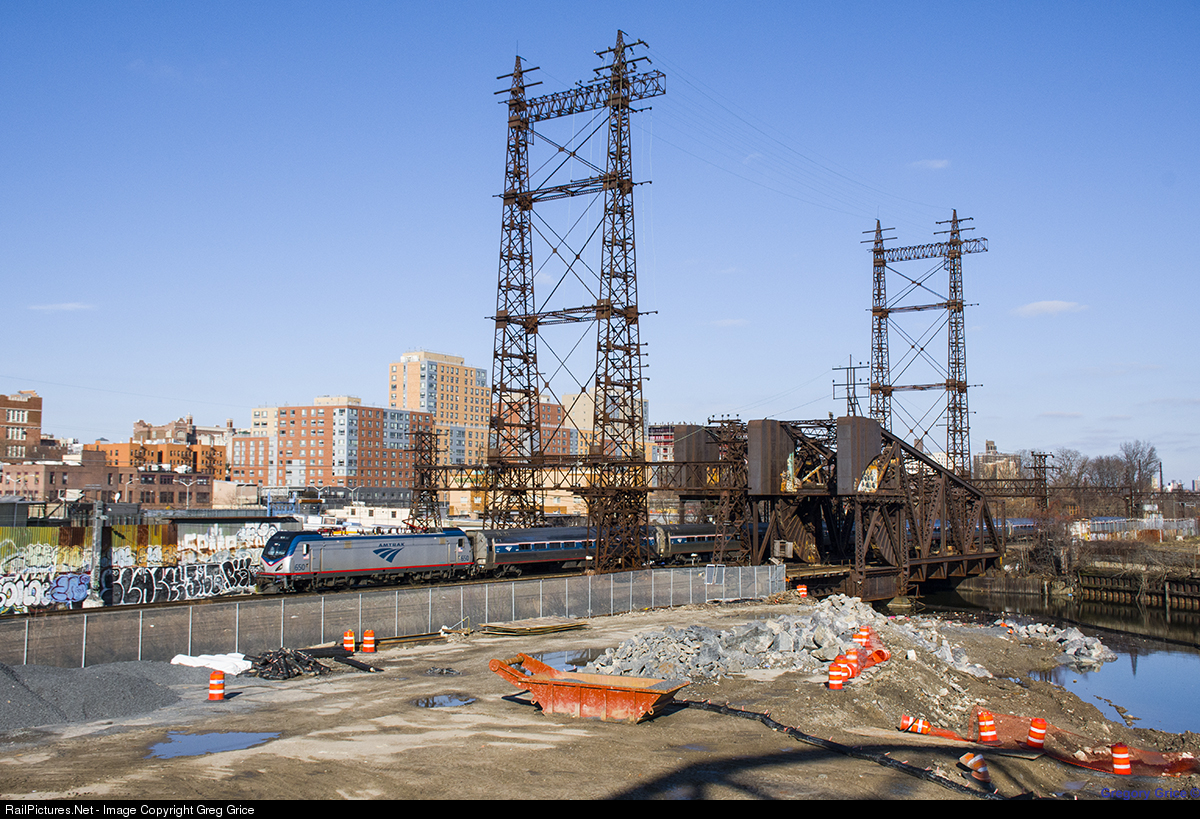 Amtrak Northeast Regional 147 heads east over NYNH&H RR Bridge #3.40 also known as the "Bronx River Bascules" on Amtrak's Hell Gate Line. The bridge was built by the Pennsylvania Steel Company for the New York, New Haven & Hartford Railroad in 1908 and originally carried 6 tracks over the Bronx River. Today the Bridge carries 3 tracks, 2 Amtrak and 1 CSX and is permanently locked shut after the huge decline in boat traffic in the area. Due to the location of the Bridge, this is the only full view of the span. This was made possible by work being done on a piece of land that was reclaimed by the City of New York in a $40 million Bronx River Greenway expansion that will connect Starlight Park and Concrete Plant Park. Once this project is complete, the bridge will be forever be blocked by a new pedestrian bridge.