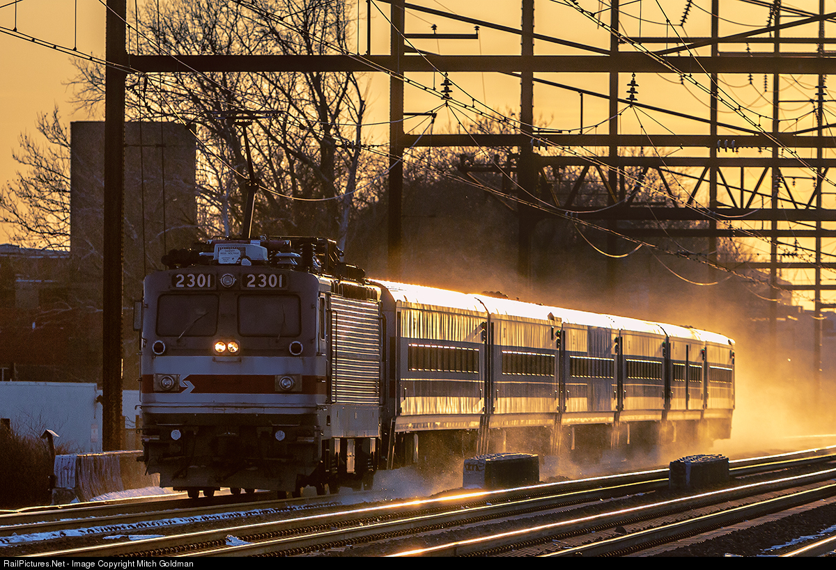 | SEPTA's AEM-7 No. 2301 makes a late evening appearance in Bridesburg located in the northeast part of Philadelphia with a push-pull set bound for Trenton, NJ. |