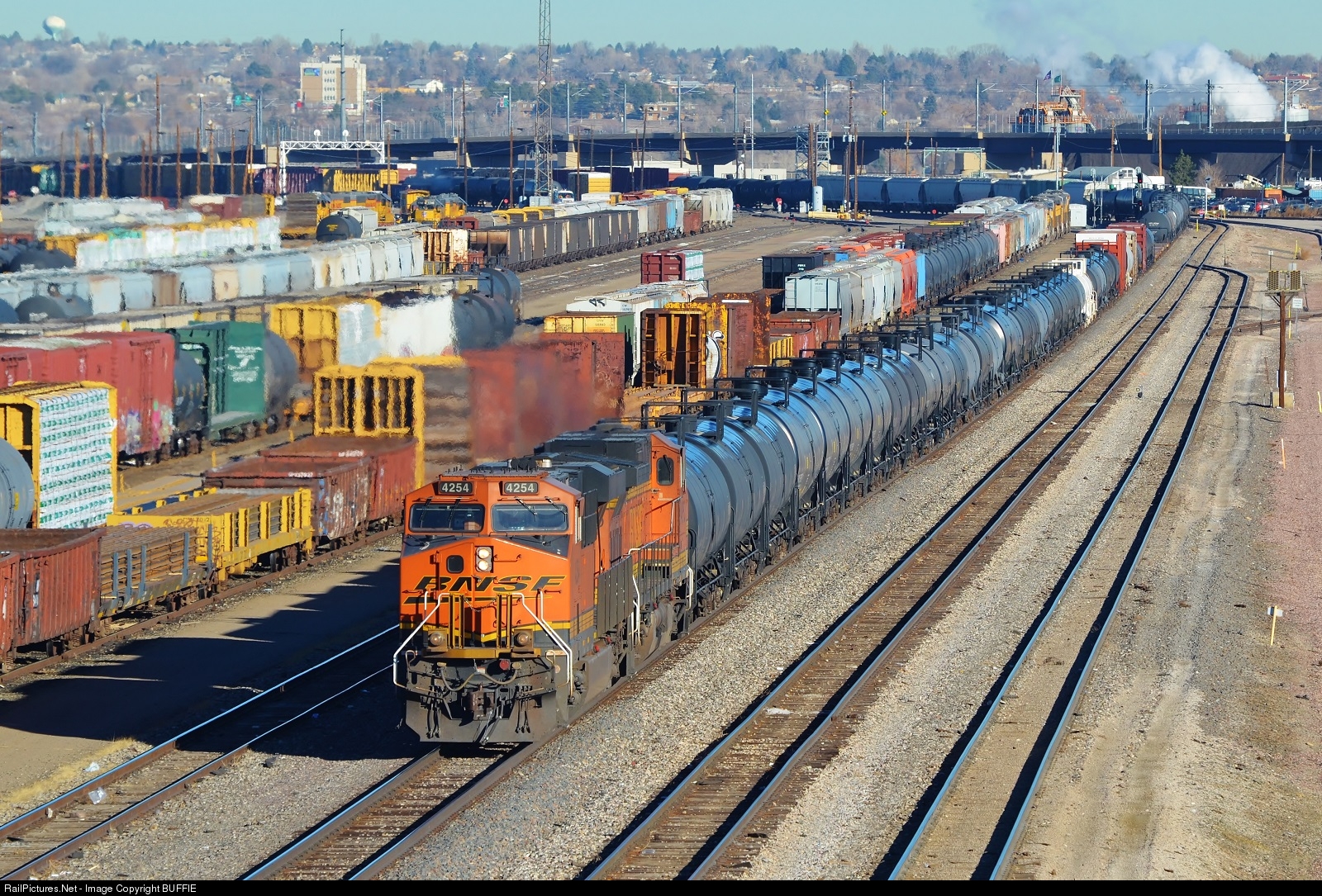 | BNSF 4254 (ES44C4) is shoving hard on a freight passing the UP's North Yard and it will soon turn left as it heads west into the Colorado Rocky Mountains on the Moffat Line. |