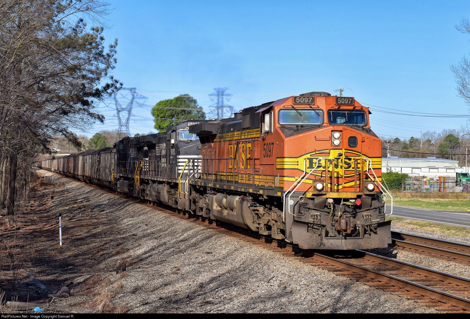 | Far from home territory, BNSF C44-9W No. 5097 leads eastbound Norfolk Southern coal loads through Chesapeake, VA on its way to Lambert's Point. |