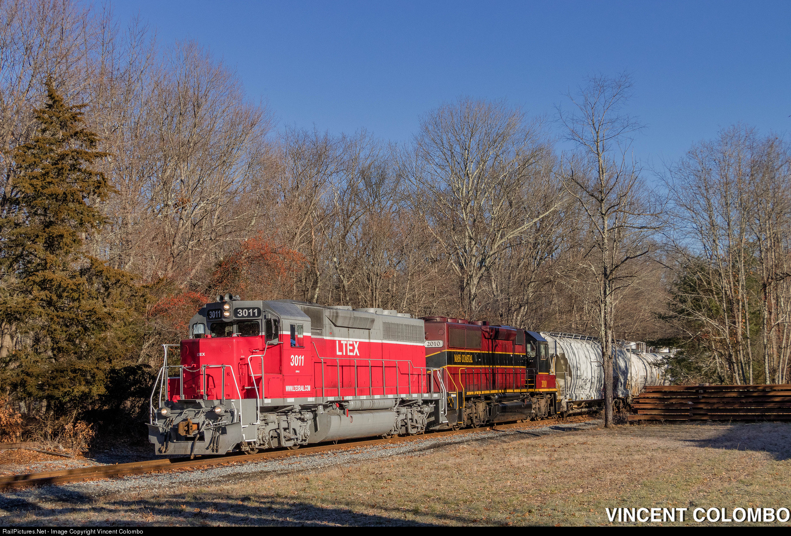 | After much frustration that both units were long hood forward for the southbound run of MC-4, Santa brought the gift of a wye move for LTEX 3011. So on the day after Christmas 2018, 3011 and MC 2010 head to Fall River with a train from Taunton, seen at Elm Street in Freetown in a bright morning sun. |