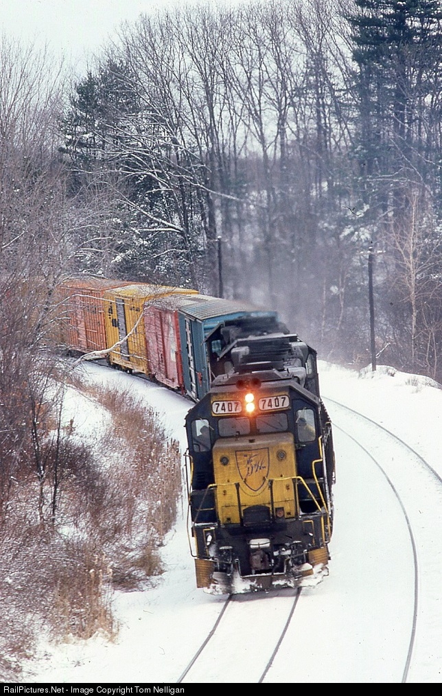 Working west on Boston & Maine rails with train POPY, a trio of Delaware & Hudson GP39-2s swing through North Leominster, MA, on a snowy winter morning. POPY was the Guilford organization's long distance B&M/D&H runthrough connecting Rigby Yard In Portland, ME, with Potomac Yard in Alexandria, VA.