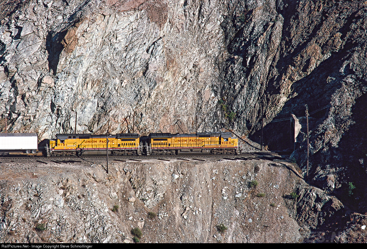 Looking like a model on a well-scenicked model railroad, UP 9108 West approaches the east portal of tunnel 9 deep in the Feather River Canyon. Rock slides in this area are common, and UP routinely has hi-railers on line the checking for problems ahead of trains. The westbound's speed is restricted here, but once she reaches the Sacramento Valley at Oroville, her engineer will quickly have her doing 70 mph.