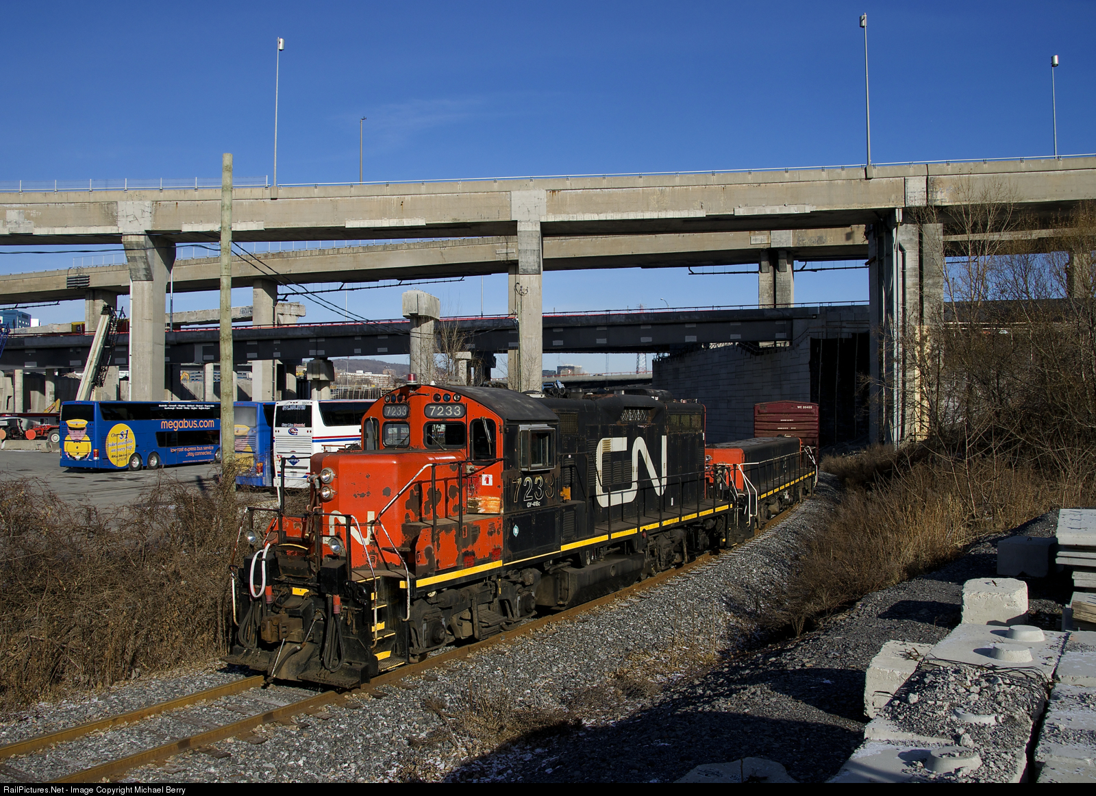 | The Pointe St-Charles switcher has GP9 CN 7233 and slug CN 227 for power as it heads towards the Kruger plant with one boxcar in tow. The train is on the Turcot Holding Spur, which reopened around the start of the month after being closed since August, due to infrastructure and track work nearby. |