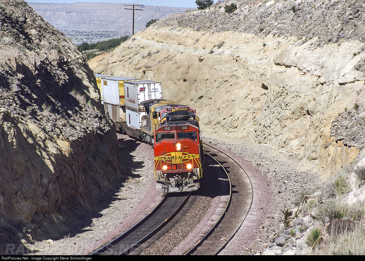 BNSF 132 West thunders through a deep cut at Laguna, NM, as it climbs toward the Continental Divide. The name "Laguna" derives from the fact that in the past a lake existed in the area; it's gone now. Laguna, along with nearby Mesita to the immediate east, are surrounded by beautiful mesas and other exotic landforms.