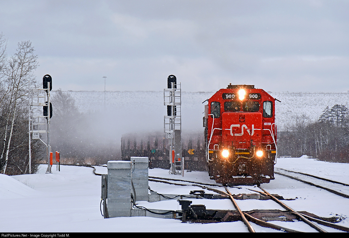 | After loading their train, BLE 900 takes the signals out of the yard at United Taconite to enter the CN Missabe Sub for the trip back to Proctor, MN. |