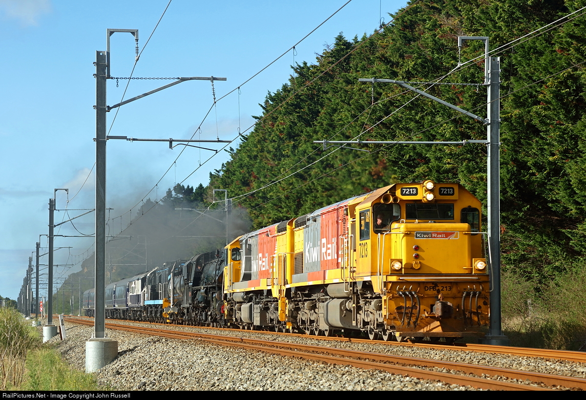 Trains on 3' 6" (1.067m) track from Whangarei to Bluff with virtually heritage rebuilt EMD and GE locomotives still the mainstay power. The network was privatized in 1990's and operated by Toll until 2008 when state owned KiwiRail was established.