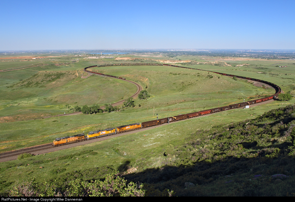 Leaving Denver behind on a beautiful June 9, 2013, afternoon, a westbound Union Pacific coal empty wraps itself around Big 10 Curve as the head end passes by the east switch at Eisele, Colorado, during the sinuous climb to the Moffat Tunnel.