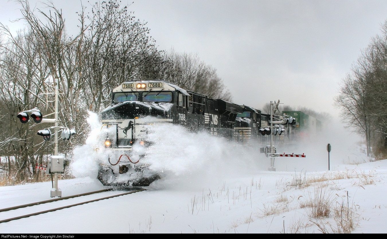 Five years ago today, the first train of 2014 to run (over my territory) on the Lafayette District was stack train 21T. NS decided to close down the railroad for the New Year's holiday, so this train was tied down in Peru, Indiana sometime during the afternoon of December 31st. It began snowing on New Year's day and continued throughout the night. The roads were a mess, but my signal duties called, so I trudged through the snow-covered roads to perform my monthly signal tests/inspections at the County Road E 1400 N crossing. While I was there, the Fountain County plows passed through leaving a sizeable pile of snow on the crossing. I immediately spotted a good photo op, and with 21T already calling signals to my east and just a few minutes away, I readied my camera to record the train's passage. Afer shooting all three units in a barrage of chunky, wet and flying snow, I quickly took refuge inside my truck and did my best to do a roll-by inspection as the lengthy train rolled by at 57 MPH!