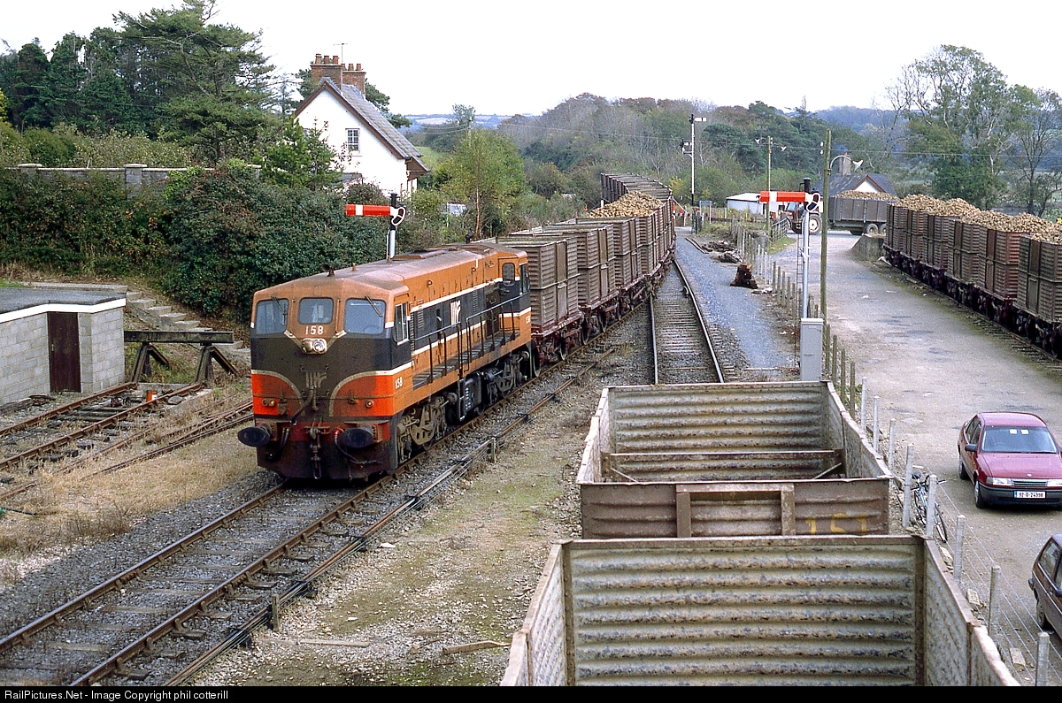 General motors loco 158 is seen at Wellington Bridge during the busy sugar beet season during 1993. Beets were loaded, here, to travel to the factory at Mallow. I believe the wagons were made from 2 wagons (coal wagons?) welded together. The Mallow factory closed in 2010, bringing an end to this interesting operation.