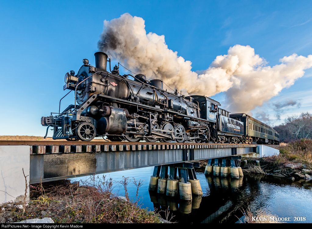North Pole Express: Making a Living with Steam. The Valley Railroad's New Haven Mikado #3025 glows just a bit in the waning sunlight, as she takes the first of the evening's sold-out, North Pole Express Trains across Deep River Creek en route to North Chester, Connecticut.