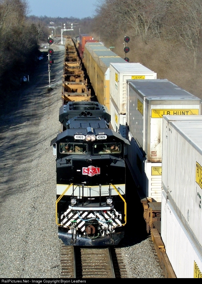 The crew of I23 was loving the publicity that day, as evidenced in this scene of 1065 leading the train through South Danville. The 9,000' baretable train passes under and between the Southern era searchlights at SD, and appropriately, a unit dressed in the Tuxedo scheme had the honors that day.